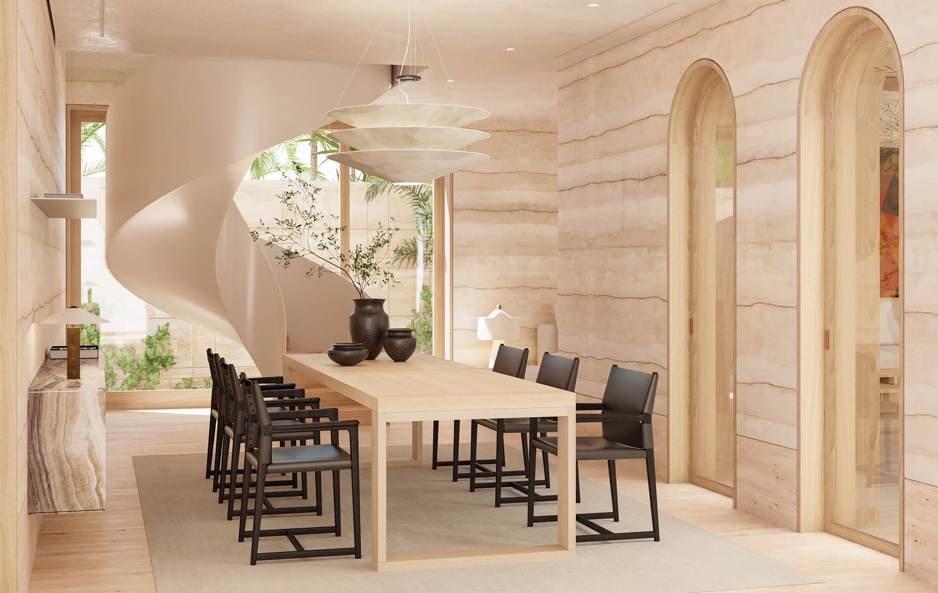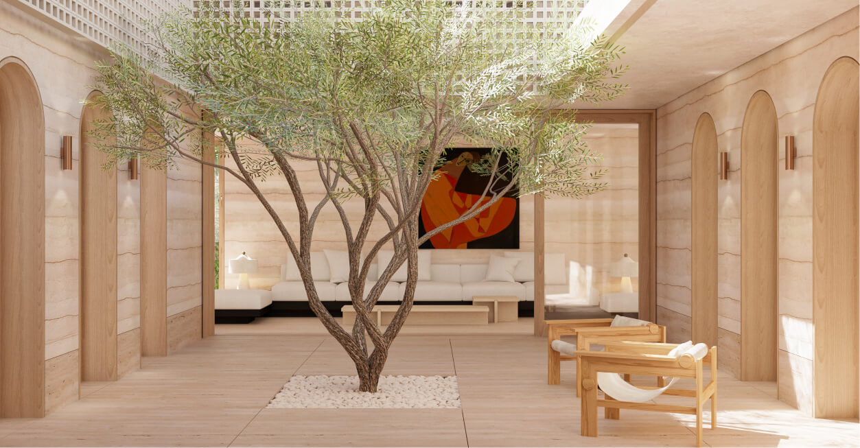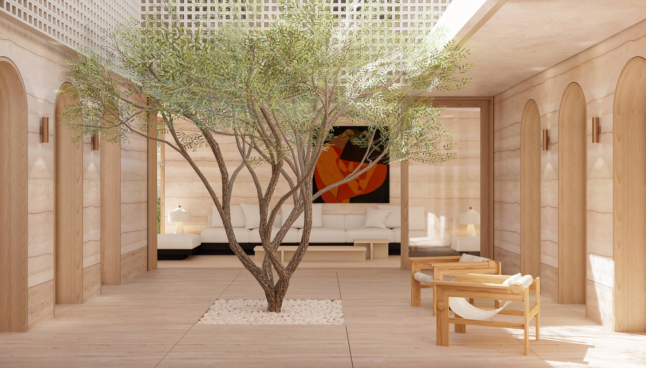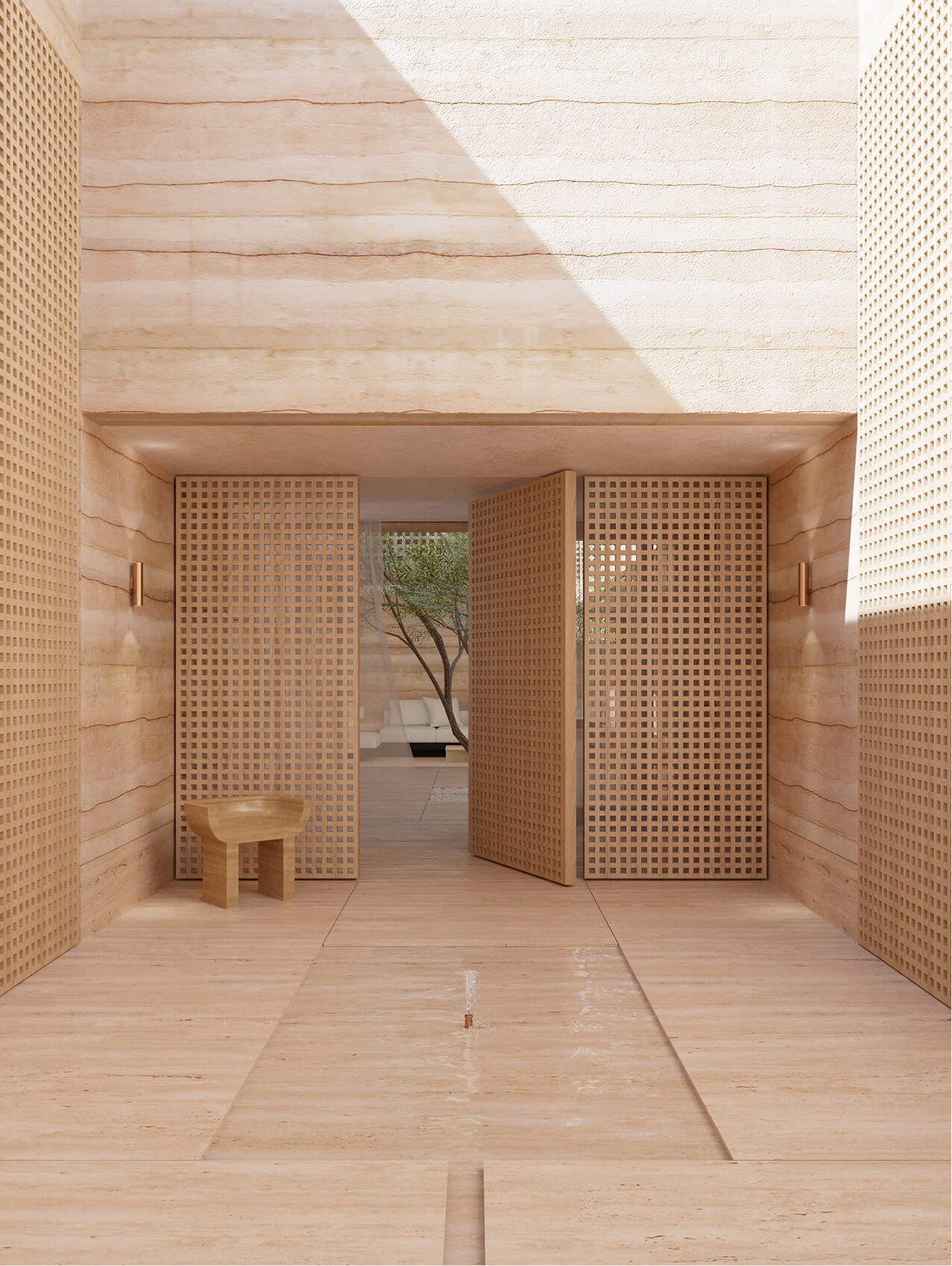 The social patio welcomes visitors, marking the threshold to the private family courtyard. Purity and minimalism, softly realized through the synthesis of irreducible elements: water, stone and light.