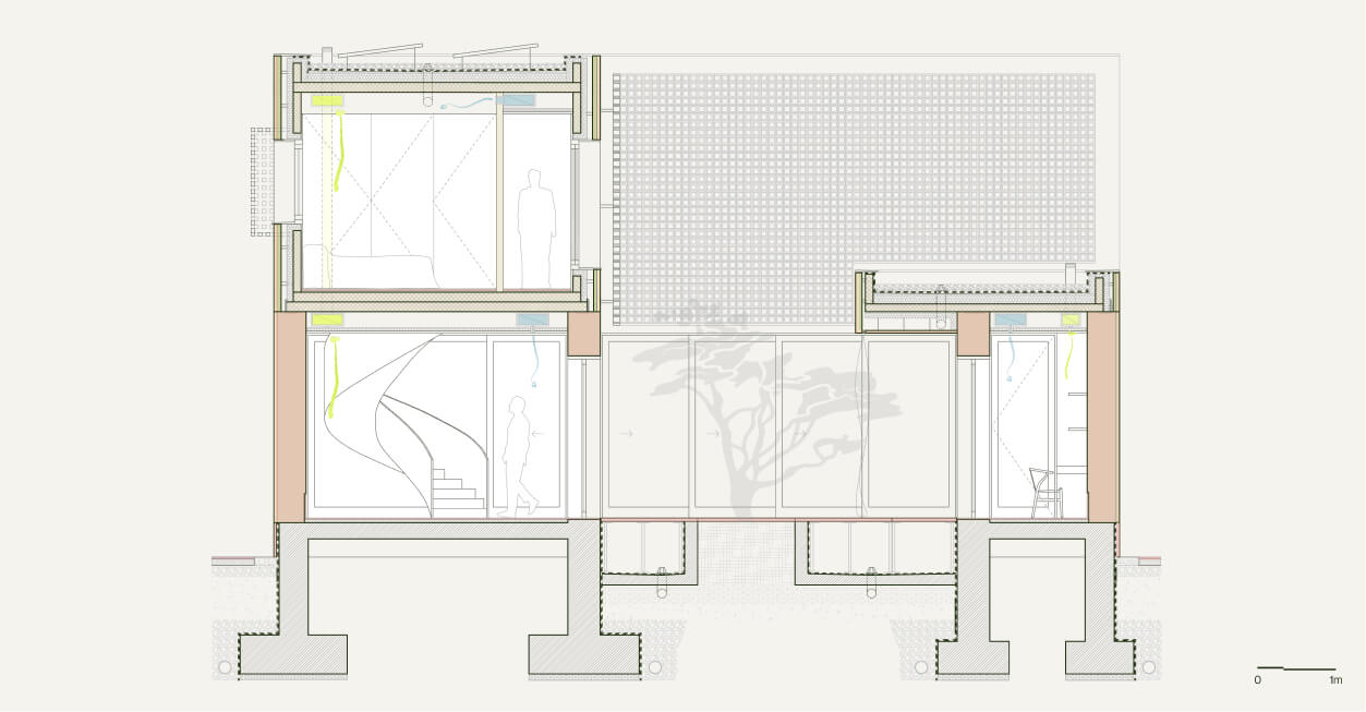 In winter, the house relies entirely on passive design: its thick earthen walls store daytime heat and release it slowly at night, while the layout captures low sun angles to maintain thermal comfort through the mild season.